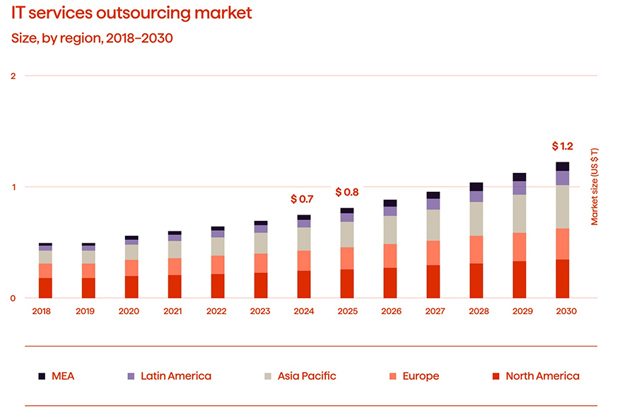 从宏观经济数据的角度来看,IT服务外包市场的增长潜力巨大。根据Grand View Research的数据,2024年全球IT服务外包市场估值已达7446亿美元。更令人瞩目的是,预计到2030年,这一数字将攀升至1.21万亿美元。这一增长轨迹意味着市场将保持8.6%的年复合增长率(CAGR)。